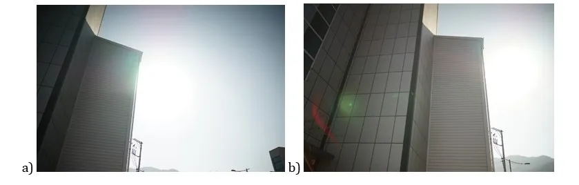 Fig.9. Outdoor tests of the glare resistance a) at the center and b) at the edges of the frame.