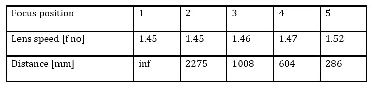 The lens speed of the optical system was determined for various focusing distances using the Code V software, and the results are presented in Table 2. The simulations indicated a lens speed of f/1.45. The deviation between the simulated value and the nominal specification is smaller than the resolution of a standard photographic light meter, which is approximately 0.3 aperture stops.