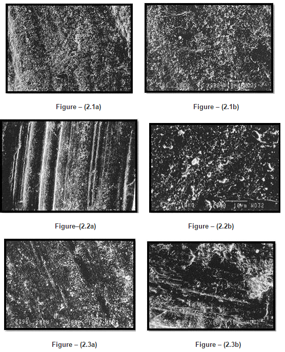 Figure 2. SEM Pictures of Surface Changes on Composite (3M Z350) (2.1a) in Yakult Solution at 30 Minutes and (2.1b) in Yakult Solution at 75 Minutes- (2.2a) in Orange Juice at 30 Minute and (2.2b) in Orange Juice at 75 Minutes – (2.3a) in Saline Solution at 30 Minute and (2.3b) in Saline Solution at 75 Minutes
