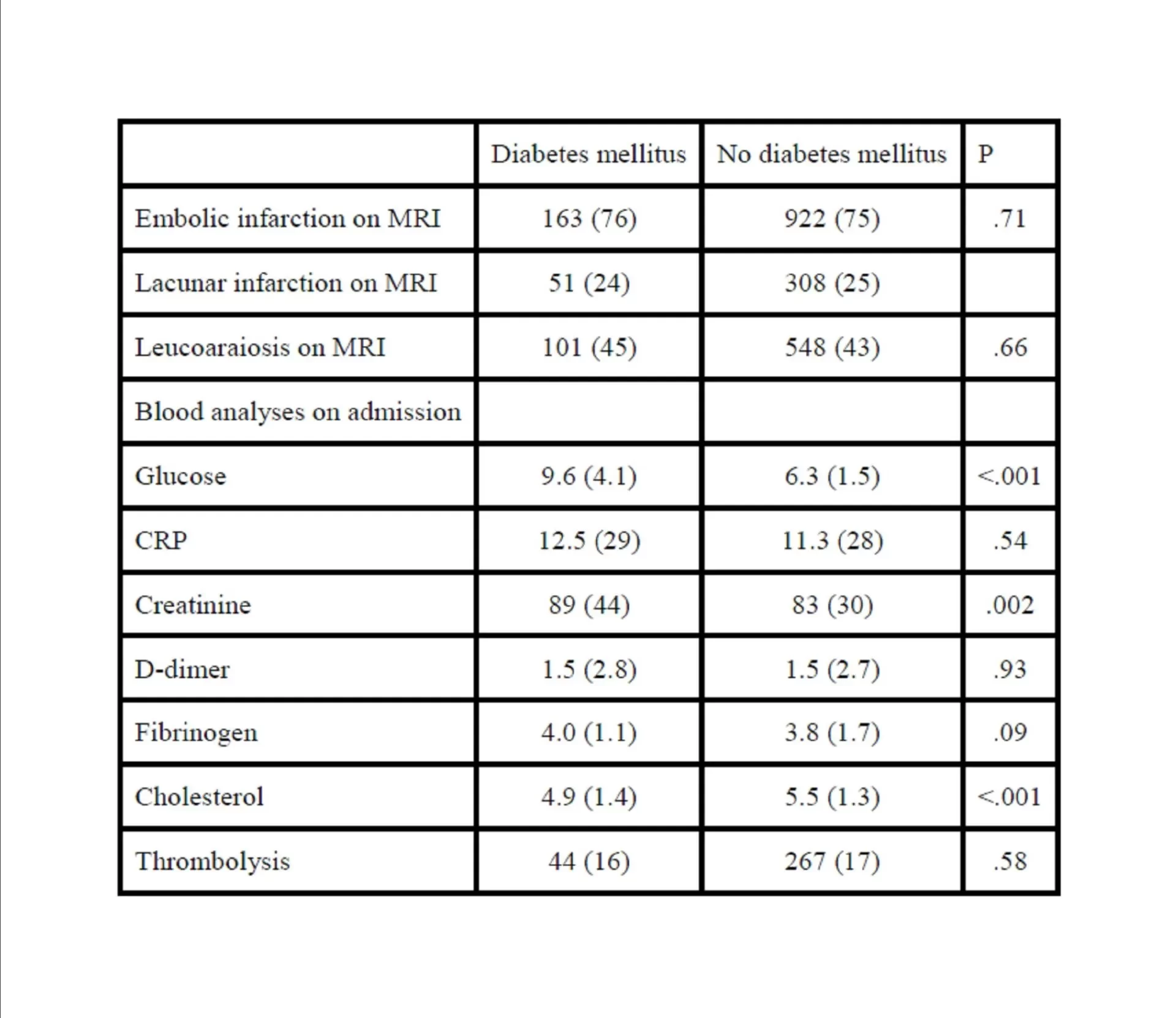 Patients with diabetes mellitus and cerebral infarction have poorer short-term functional outcome, more complications, more early readmissions and higher long-term mortality than patients with cerebral infarction and without diabetes mellitus. Relative frequencies of diabetes mellitus and age differed between males and females.
