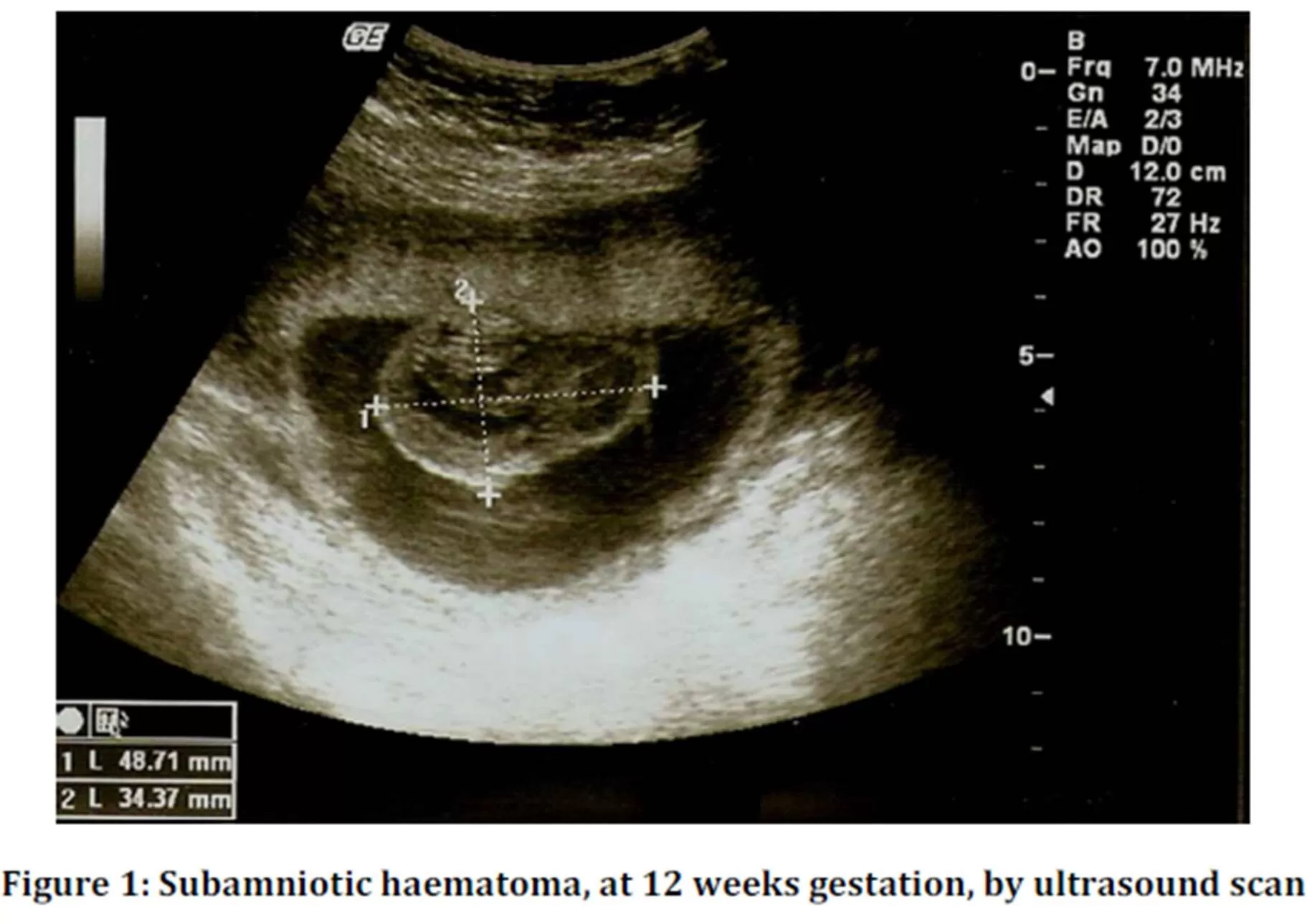 In the 1st trimester ultrasound scan, at 12 weeks gestation, it was observed a hypoechogenic image, indissociable from the placenta, with 49 mm of diameter — see figure 1.