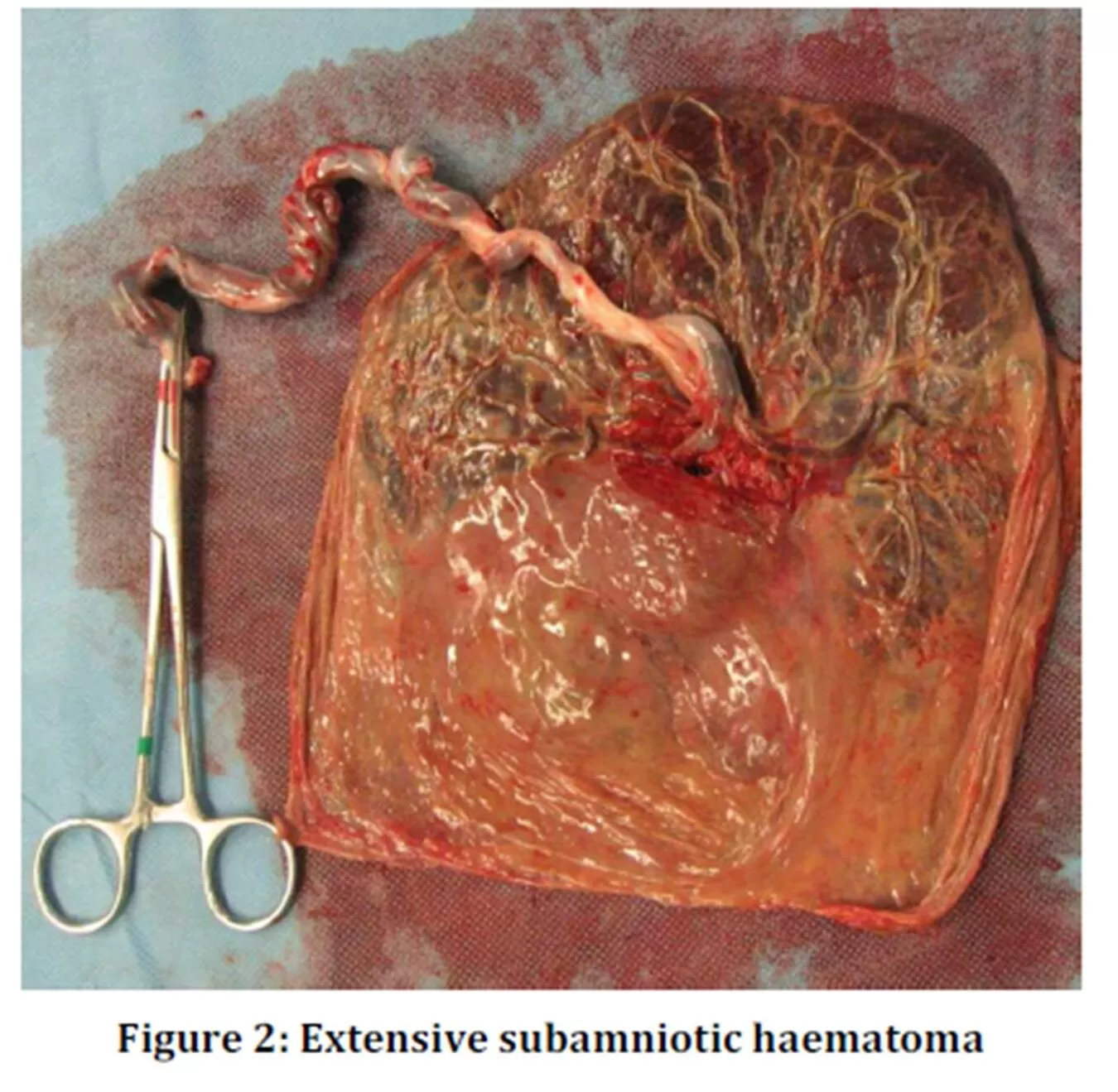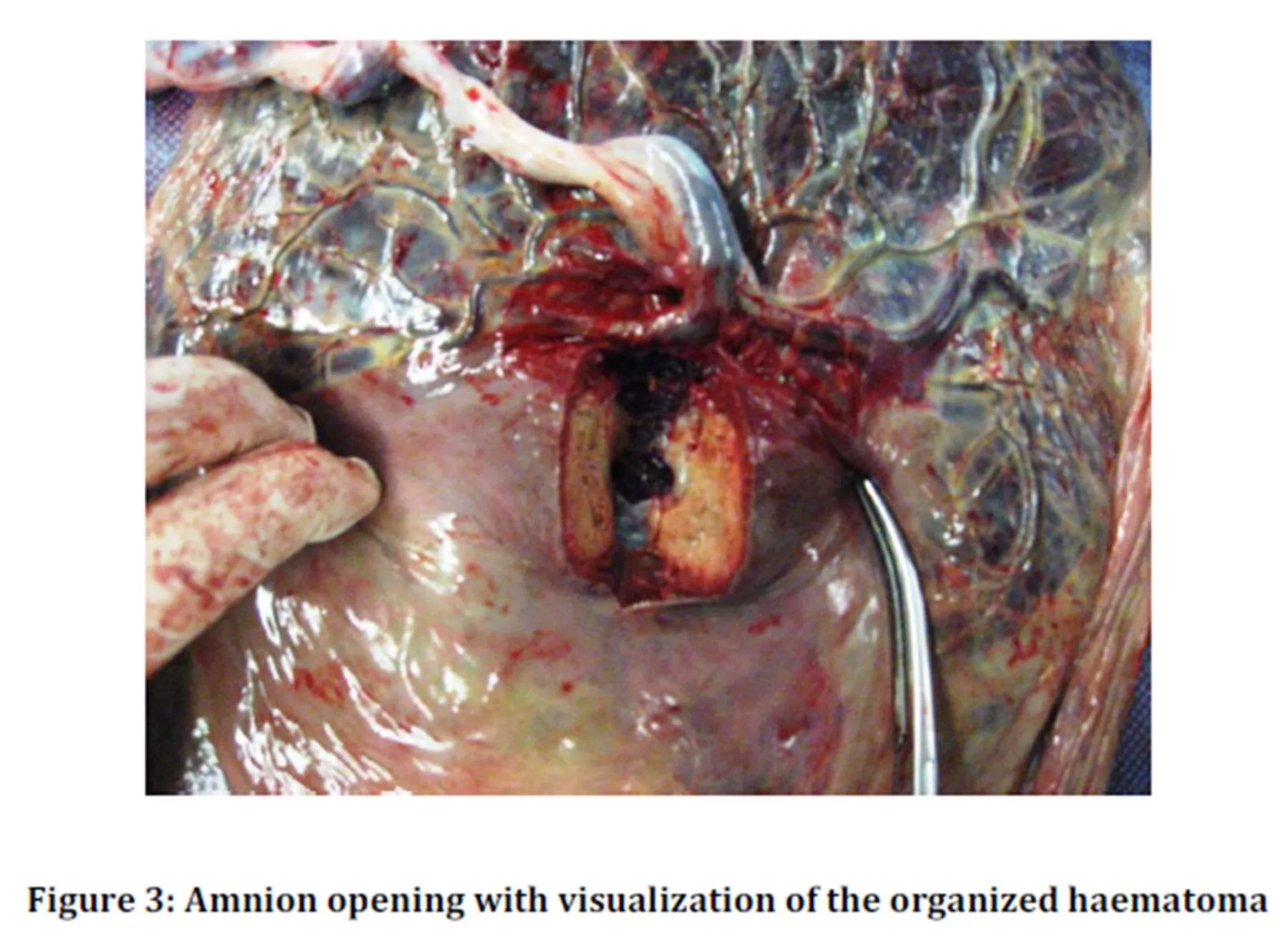 Subchorionic haematomas are between the chorion and endometrium; Retroplacental haematomas are entirely behind the placenta and not touching the gestational sac; Subamniotic or preplacental haematomas are contained within amnion and chorion. Of the three different types of placental haematomas, subamniotic haematoma is considered the rarest. Although small placental haematomas are usually asymptomatic, Hodgson et al (2007) mentioned that they can originate vaginal bleeding, abdominal pain, premature labour and threatened abortion.