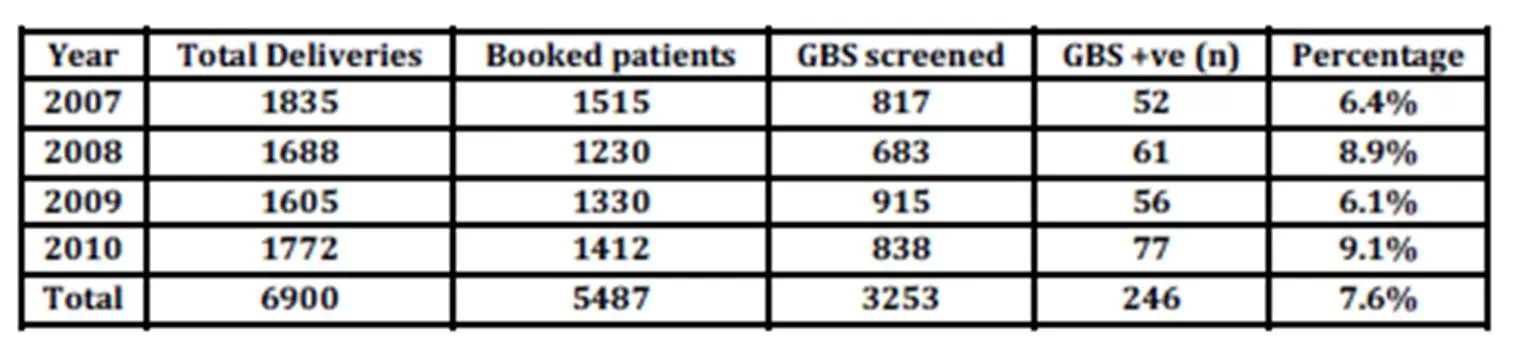 During the study period, 5487 women were booked for antenatal care at Kingdom Hospital, of whom 3253 (59.3%) were screened. GBS colonization was detected in 246 (7.6%) women, who delivered 251 babies (5 twins) (Table 1). GBS was found in the AGS alone in 186 (75.6%), urine in 28 (11.4%) and both AGS and urine sample in 32 (13%) women. (Table 2)
