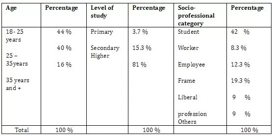 As we do not have a sounding base, the sampling method by convenience is adopted. Our choice of this method is explained by the fact that it is simple and practical to use, also we tried to exceed some limits met in the previous researches which consisted in targeting students considering their availability. We want to touch all the possible categories (students, liberal profession, employee, executive, worker, housewives), where an age bracket between 18 and 35 years is selected to represent all these categories as well as possible.