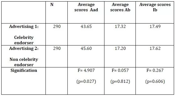 According to the results above, there exists a significant difference for the average scores obtained for attitude toward advertising, in the case of celebrity and non celebrity endorser (43.65 < 45.60). We note a significant value of F (p=0.027 <0.05). We can conclude that the women exposed to advertising by a non celebrity generated more favourable attitudes towards advertising than those generated by a celebrity. Which cancels our hypothesis, H4.1 is cancelled.