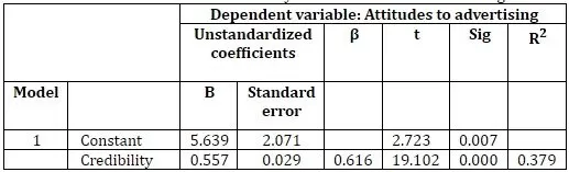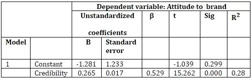 It is deduced from this table that endorser’s perceived credibility has a positive effect on attitude to the brand (t = 15.26> 0, Sig = 0.000< 0.05), as R2 = 0.28 means that credibility explains 28% of attitude toward the brand. Therefore, more endorser is perceived to be credible more he generates more favourable attitudes toward the brand.