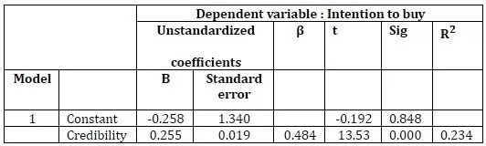 According to results of table 4, we note that endorser credibility (famous and non famous) has a significantly positive effect on purchase intention (t = 13.53>0, Sig = 0.00< 0.05), as R2=0.234 means that credibility explains 23.40% of purchase intention. We can say that more endorser is perceived credible most he induces favourable intention to buy.