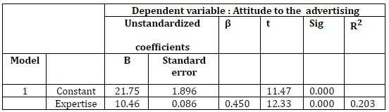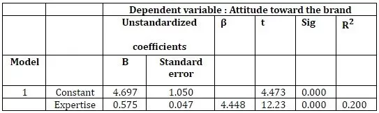 Table 5 shows that expertise influences in a significant way attitude toward advertising and this is confirmed by (t = 12.33>0 Sig = 0.00< 0.05) and R2 = 0,203, it means that perceived expertise toward endorser explains 20.30% of advertising attitude. More endorser is perceived as expert, he induces a more favourable attitudes towards publicity.