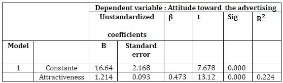 According to this table, attractiveness has a positive effect on the attitude to advertising. An attractive endorser generates a favourable attitude towards publicity (with t = 13.12 >0 Sig = 0.00< 0.05) and R2 = 0,225. The attractiveness explains 22.40% of the attitude toward publicity.