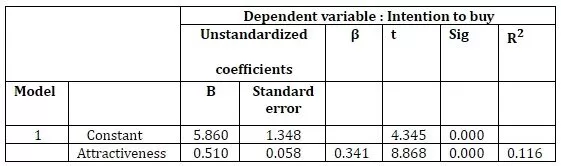 The attractiveness has a significantly positive influence towards purchasing intention (with t = 8,868>0 Sig = 0.00< 0.05) and R2 = 0,116. The attractiveness explains 11.6% of intention to purchase. What proves that an attractive endorser generates more favourable intentions to purchase.