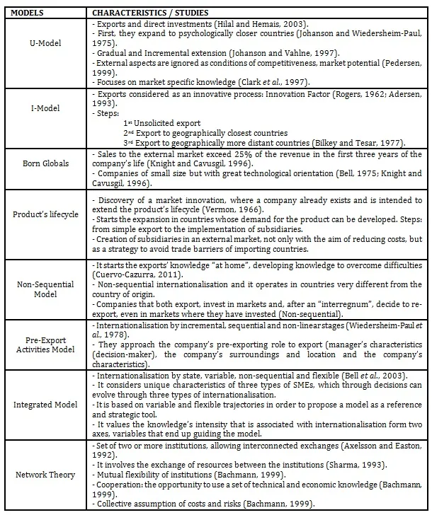 In this context, it is intended from a broad literature review to systematise the research and characterise the main theoretical approaches and the main internationalisation models (IM) used by companies in this process.