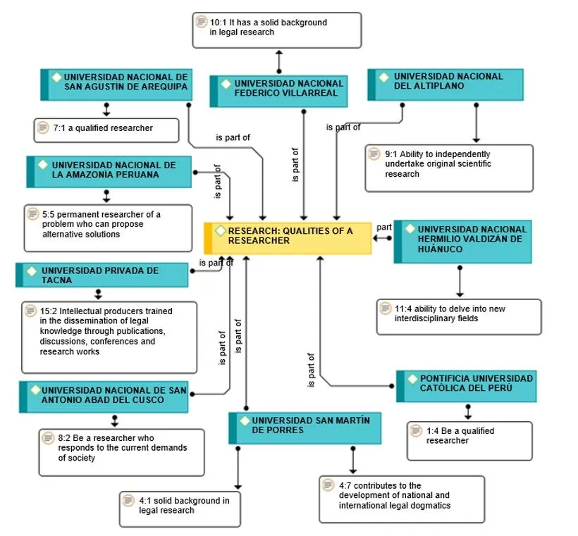 Figure 6 shows the legal or specialty training and its relationship with teaching or its support in research. Education implies the proposal of innovative doctrines in the legal or political science areas (Universidad Nacional Mayor de San Marcos), the interpretation of legal dogmatics (Universidad Santiago Antúnez de Mayolo), deepening the spatiality to answer hypotheses based on scientific knowledge, (Universidad Nacional del Altiplano), as well as a high academic level in the legal field (Universidad San Antonio Abad del Cusco). Based on professional or scientific training, in this case, it is specified that the teacher successfully teaches at the postgraduate level (Pontificia Universidad Católica del Perú, San Agustín de Arequipa), teaches in public or private institutions in under or postgraduate degrees in the various legal specialties (Universidad San Martín de Porres), is prepared to train qualified jurists (Universidad HermilioValdizán de Huánuco), is a facilitator of learning based on technology (Universidad Nacional de Piura, Universidad Nacional de la Amazonía Peruana), exercises teaching with an emphasis on legal research (Universidad César Vallejo, Universidad Privada de Tacna), and masters a legal theory and techniques in teaching (Universidad Federico Villarreal).