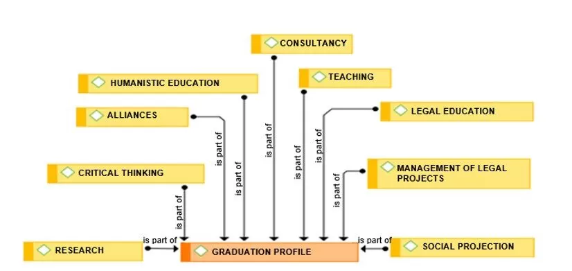 Figure 1 shows the categories identified in the graduation profiles: counseling, teaching, legal education, management of legal projects, social projection, research, critical thinking, alliances, and humanistic education. Research has a higher prevalence.