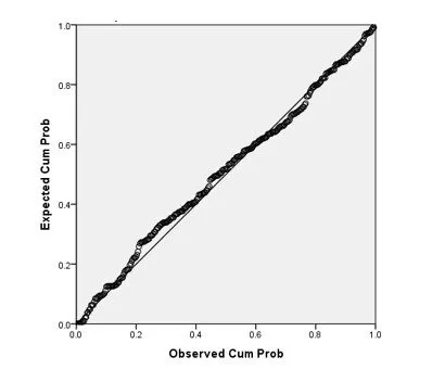 This section is devoted to conduct the regression analysis after the factor analysis and correlation analysis have been carried out. Correlation was used to test whether there is a correlation between the dependent variable and the independent variables. However, it is not enough to examine the impact of the independent variables on the dependent variable. Moreover, the correlation analysis showed the relationship between the variables, but it did not show the magnitude (how much) and the direction (positive or negative) of the relationship. Thus, the regression analysis was needed to examine the impact of the independent variables on the dependent variable in this study. Figure 1 shows the normal P-P Plot of Standardized Residual.