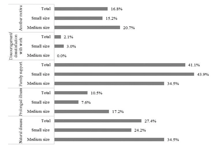 As shown in Figure 1, regardless of the municipality size, the reasons given as a justification for the absence of the worker were: support for family members (41.1%), natural disease (27.4%), prolonged illness (10.5%), demotivation and/or job dissatisfaction (2.1%), among others (16.8%), namely, civic activities, medical consultations and hospitalization (surgery), compliance with court orders, risky pregnancies and maternity, personal reasons and exemptions for tests by a worker-student.