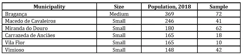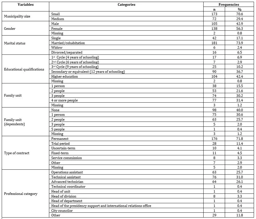 This quantitative and cross-sectional research was based on primary data collected from April 2018 to July 2019 in 6 municipalities from Bragança district (5 small-sized municipalities and 1 medium-sized municipality) located in Northeast Portugal. In 2018, the population/universe of this study consisted of 1273 workers distributed, in decreasing order, as follows: 369 workers from Bragança municipality, 246 workers from Macedo de Cavaleiros municipality, 180 workers from Miranda do Douro municipality, 165 workers from Carrazeda de Anciães municipality, 165 workers from Vimioso municipality and 148 workers from Vila Flor municipality. A simple probabilistic sample consisting of 245 workers was collected, with a sampling error of 5.6% (Table 1).