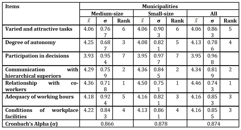 The reliability analysis of the questionnaire revealed a good internal consistency for the 7 items that constitute the variable “characteristics related to the nature of the work” (Table 3) since α = 0.874 for all municipalities, α = 0.878 for the small-sized municipalities and α = 0.866 for the medium-sized municipality). Also, the reliability analysis for the 7 items that integrated the variable “workers’ attitudes, values and objectives in relation to work” (Table 4) revealed a good internal consistency (α = 0.763 for all municipalities, α = 0.762 for the small-sized municipalities and α = 0.771 for the medium-sized municipality). Regarding the characteristics associated with the nature of the work, the “relationship with co-workers” stood out in the first three positions, regardless of the municipality size ( = 4.46; σ = 0.743), the “communication with hierarchical superiors” (= 4.36; σ = 0.786) and, in an identical position, the “adequacy of working hours” ( = 4.16; σ = 0.853), as well as the “conditions of work facilities” ( = 4.16; σ = 0.855). The items that occupied the first two positions remained in the same position in small and medium-sized municipalities. However, in the third position, for workers who worked at small municipalities, the “adequacy of working hours” stood out as the most important ( ̅ = 4.16; σ = 0.821) while for workers who worked at the medium-sized municipality, the “degree of autonomy at work” was more important ( = 4.25; σ = 0.687), as shown in Table 3.