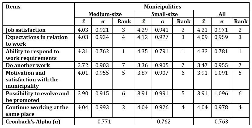 Regarding the workers’ attitudes, values and objectives in relation to work, regardless of the municipalities size, in the first two positions, with the highest levels, are the “ability to respond to work requirements” ( = 4.33; σ = 0.781) and “job satisfaction” ( = 4.21; σ = 0.971). The items that occupied the first two positions maintained the same position in small municipalities. However, at the medium-sized municipality, the second position was occupied by the item “continue working at the same place” ( = 4.04; σ = 0.993), as shown in Table 4.