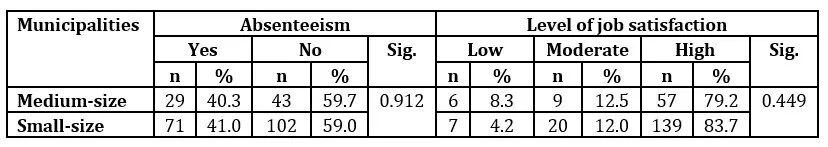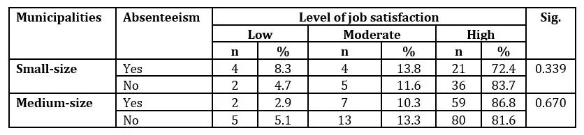 On the other hand, the results showed that both at small and medium-sized municipalities, the number of workers who were absent from their workplace is the same considering the level of job satisfaction (Sig. > 0.05). In other words, absenteeism is not associated with the level of job satisfaction (Table 6).