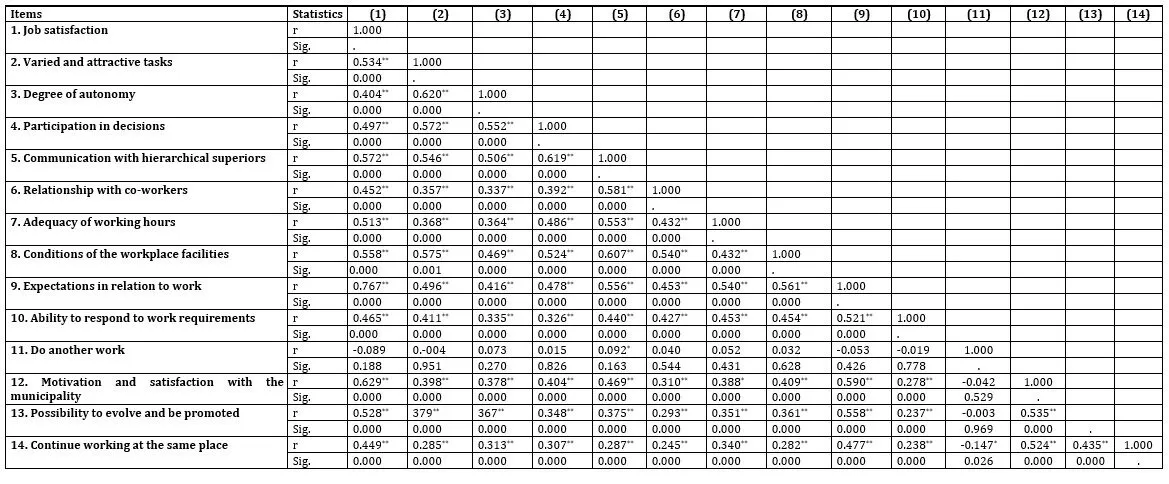 Job satisfaction showed correlations that ranged from moderate to high with the items “expectations in relation to work” (r = 0.767; Sig. = 0.000), “motivation and satisfaction with the municipality” (r = 0.629; Sig. = 0.000), “communication with hierarchical superiors” (r = 0.572; Sig. = 0.000), “conditions of the workplace facilities” (r = 0.558; Sig. = 0.000), “varied and attractive tasks” (r = 0.534; Sig. = 0.000), “possibility to evolve and be promoted” (r = 0.528; Sig. = 0.000), “adequacy and flexible working hours” (r = 0.513; Sig. = 0.000), “participation in decisions” (r = 0.497; Sig. = 0.000), “ability to respond to work requirements” (r = 0.465; Sig. = 0.000), “relationship with co-workers” (r = 0.452; Sig. = 0.000), “continue working at the same place” (r = 0.449; Sig. = 0.000) and “degree of autonomy” (r = .404; Sig. = 0.000). On the other hand, there was no evidence of a statistically significant correlation between job satisfaction and the item “do another work” (r = -0.089; Sig. = 0.188), as shown in Table 7.