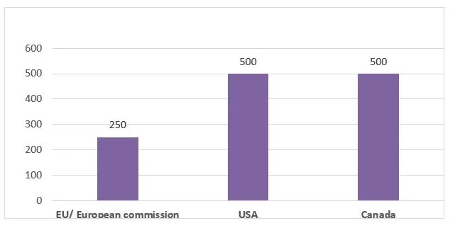 SMEs in the EU according to the European Commission recommendation of May 6th, 2003 have up to 250 persons employed (European commission, Eurostat 2022) with an annual gross revenue of Euro 50 million compared to Canada and the USA that consider SMEs to be with up to 500 persons employed SBA and statistics Canada 2022) and with an annual turnover and gross revenue of $50 million (See figure 1).
