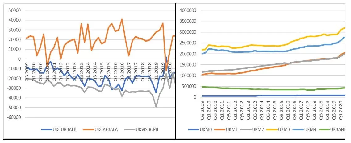The balance of payments for the current account (UKCURBALB), financial and capital account (UKCAFBALA) as well as the visible trade balance (UKVISBOPB) is shown in Figure 10 on the left. On the right, the money supply based on different indicators, M0, M1, M2, M3, M4 and M4 lending (UKBANKLPB), are shown. The financial and capital account balance has shown a volatile movement with a low point reached that was last seen in 2011 followed by a lower level at the onset of COVID-19. The current account as well as the visible trade balance have both been decreasing in 2018, with the balances reaching new levels in 2020 that had not been during the prior ten years. M0 and M4 lending have been stagnant, however, the other money supply indicators have been increasing over the past few years.