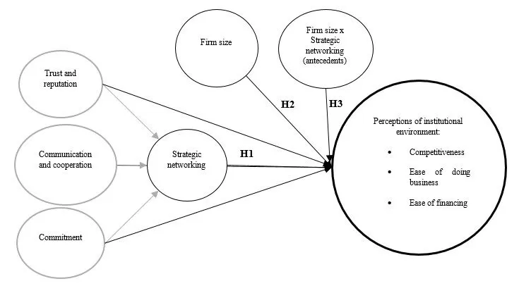 H3: Firm size moderates a relationship between strategic networking (antecedents) and perceptions of the institutional environment.