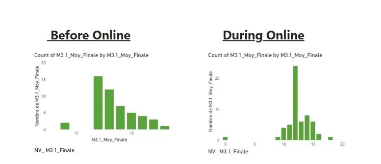 In Figure 7, all students are having grades between 14 and 18 out of 20 in the learning online mode. Before this mode grades are distributed where few have failed the module and good students are distributed between the range of 14 and 18 out of 20 similarly with the online ode with the difference of the number of students concerned. In the online mode there all students against 80% of them in the range of the good grades.