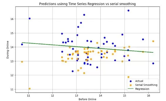 On the contrary Time Series Regression Metrics have been evaluated according to the same measures as the serial smoothing. The MAE is computed at 0.75. the value is less than the one obtained with serial smoothing. The MSE is found 0.90 and the RMSE has a value 0.95