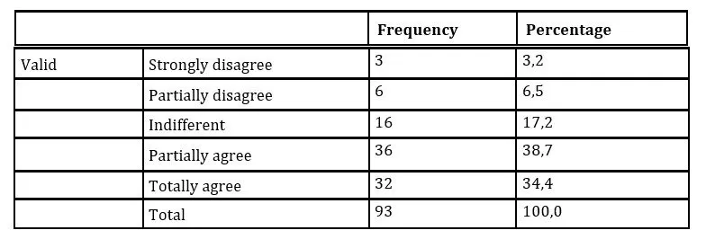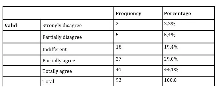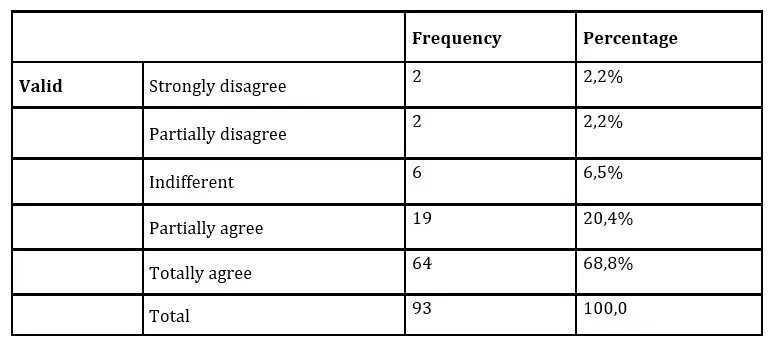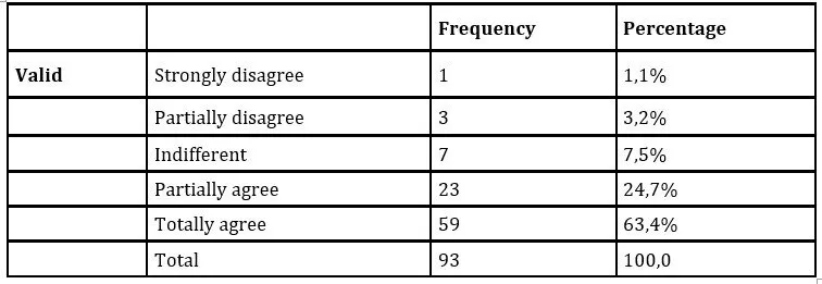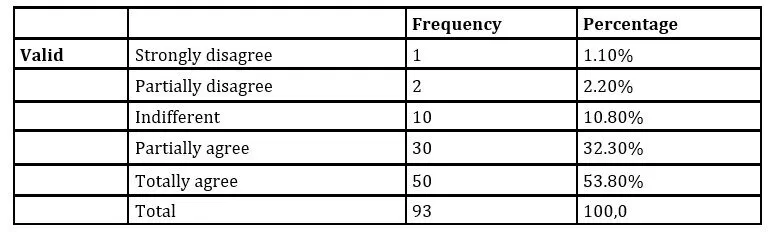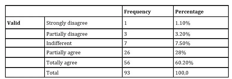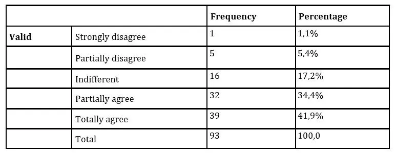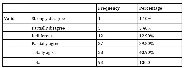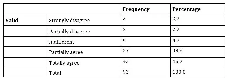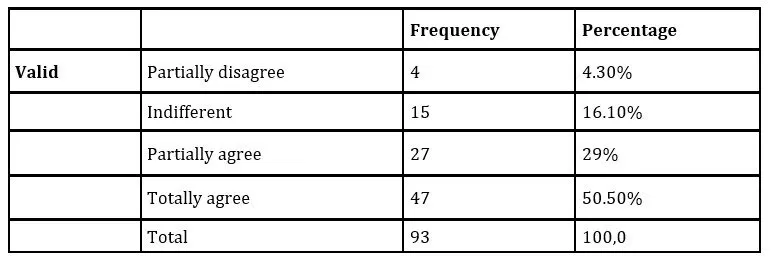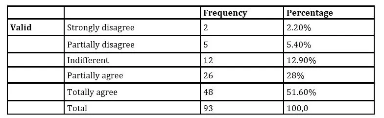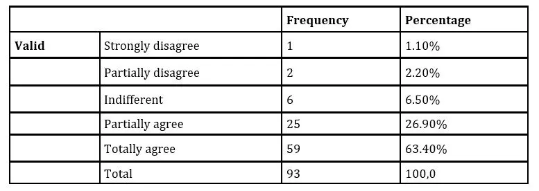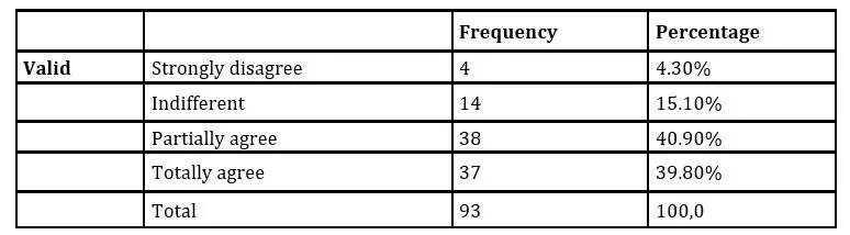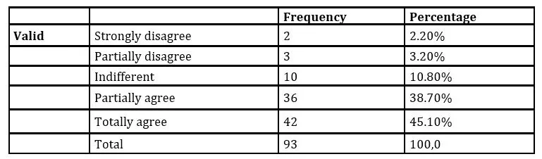 For the identification of the central tendency, the mean was calculated by adding the 93 valid data presented and then dividing this result by the total number of values. The resulting value is 4.1398, which allows us to describe the sample based on what was analyzed, this sample was represented by 5 as completely agree and 1 as completely disagree.