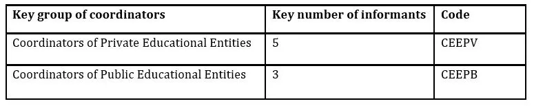 Due to the restrictions of the pandemic, the interviews with the administrative coordinators were conducted virtually. Additionally, a table was prepared showing the division of coordinators between private and public educational entities, at the discretion of the collaborators.