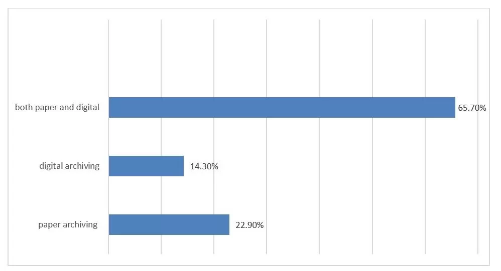 Concerning the archiving of accounts filed by clients, the results show that 65.70% of the responding clients archive their accounts in paper and online, compared to 22.9% who archive in paper only, and 14.3% of the responding clients that digitally archive their accounts.
