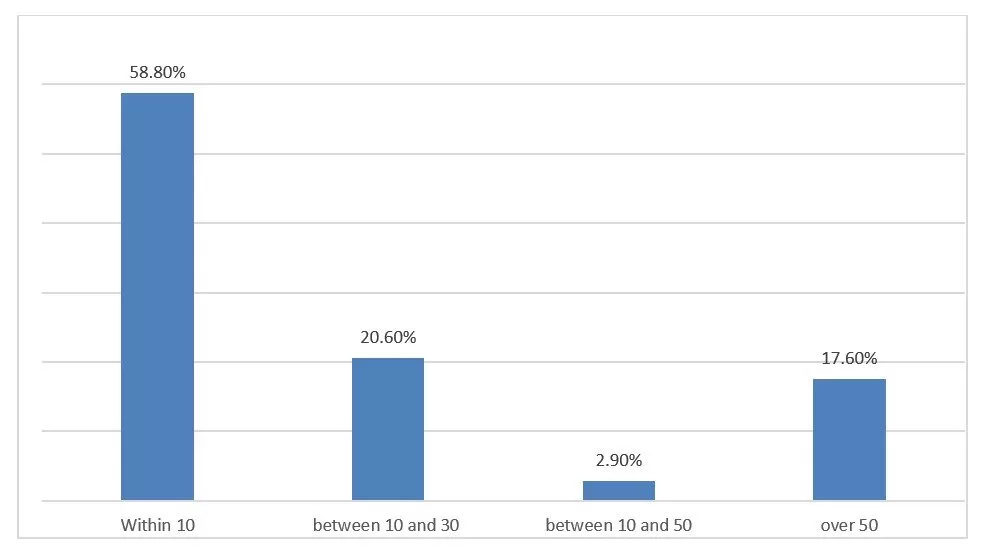 Concerning the percentages of employees employed by respondents, the results show that 17,6% of the respondents are employees in firms with more than 50 employees, 2.9% of the respondents are employees in firms with between 10 and 50 employees, 20.6% of the respondents are employees in firms with between 10 and 30 employees and 58.8% of the respondents are employees in firms with fewer than 10 employees.