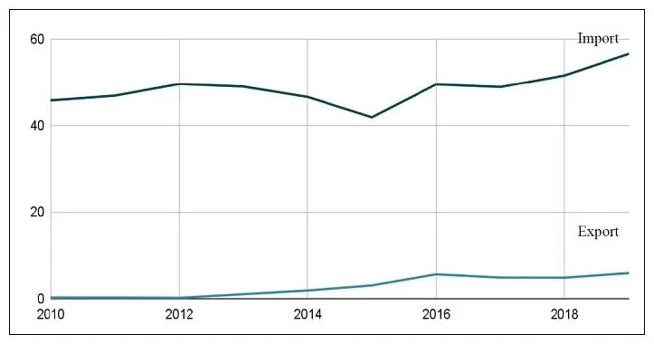 Fig 1. The import and export of pet food in Croatia in million USD (2010-2019)