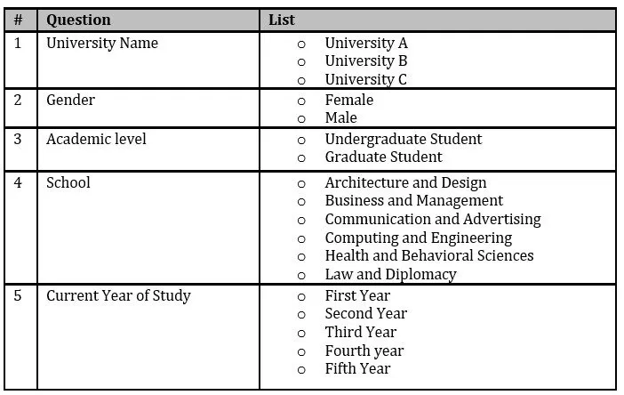 To ensure the questionnaire’s validity and reliability, the researchers adapted all the questionnaire questions from previous peer-reviewed studies by Amin (2021), Jie and Chaipinchana (2022), and Paul and Pradhan (2019) which addressed the same topic in other countries. This was done with minor adjustments to some questions to match the study settings and environment.