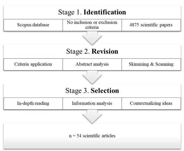 excluding documents with content of little relevance to the context of the research or whose period of time exceeds what is required, with the exception of those that provide a perception of the past that is still valid, 54 scientific articles were selected because their contribution, content and/or validity are relevant to the achievement of the objective of this research.
