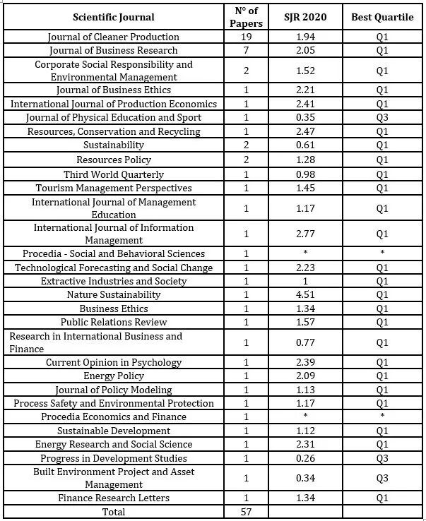 The collected articles presented in this document were obtained through SCOPUS, with the exception of 2 scientific articles and 1 book chapter provided by Springer. The main keywords that allowed collecting the scientific papers were: “Corporate Social Responsibility” (24,184 scientific articles); “Sustainable Development” (340,871); “Sustainable Development Goals” (38,558); “CSR” (24,276); “SDG” (6,768); “Sustainability” (266,168); “Corporate Sustainability” (10,561); “Environmental sustainability” (98,519); “Social sustainability” (61,903) and “Economic sustainability”. The most important combinations can be seen in the following table.