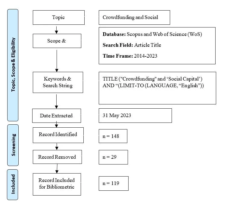 This study aims to assess recent trends in the expansion of academic literature on crowdfunding and social capital using the bibliometric analysis method. Databases from Scopus and Web of Science (WoS) are utilized to analyse collected documents with the title ‘crowdfunding’ and ‘social capital’ in the bibliometric research. The Scopus and WoS databases are considered as the main sources of related information by the international scientific community. This study analyses all types of publications released from 2014 to 2023 in the Scopus and WoS databases. Bibliometric analysis was accomplished by Scopus and WoS databases as at 31 May 2023. The search terms ‘crowdfunding’ and ‘social capital’ in the abstract, title, and keywords were used to explore for relevant articles published in English language that related to research on crowdfunding. The authors of this research study the articles’ titles, as they are the first thing that readers see. Network visualization and bibliometric indicators are used in this paper to present the results.
