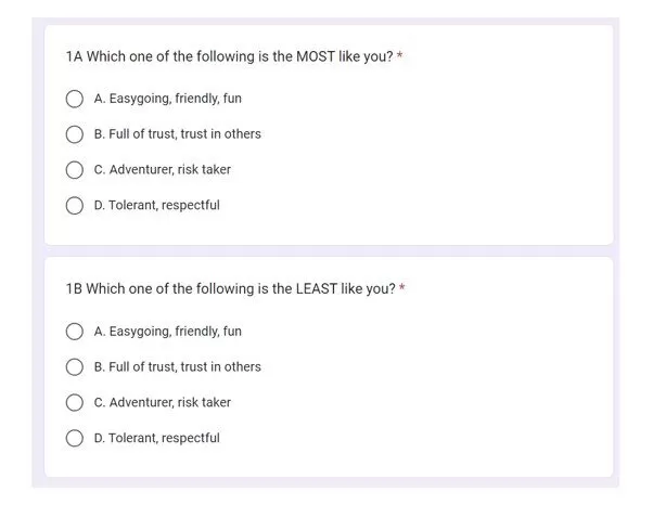 The first thing to do was to create the form. In the DISC personality assessment tool, usually for each number, people are given 4 statements and required to choose which among the 4 statements that the most like them and which one is the least like them as shown in Fig. 2. Unfortunately, Google Form does not provide an option for such type of questions. Each question has to be separated into 2 questions. One will have the “most like you” question, and the other will have the “least like you” question.