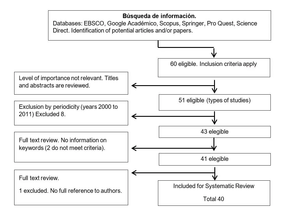 In view of the above, 60 documents were found, 40 research papers were part of the present research, which represents 66%. The documents were selected in order of their contribution to the conceptualization of the variables and the elaboration of their construct, in addition to their contribution to the determination of the theoretical relationship between both variables.