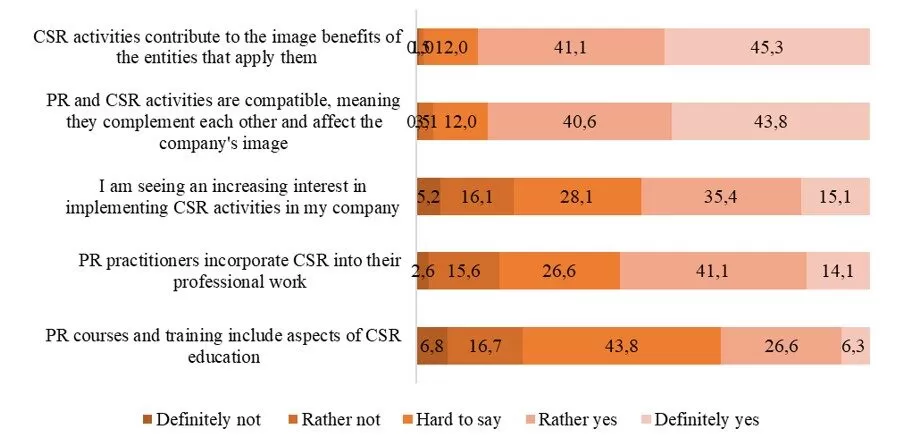The survey introduced a definition of corporate social responsibility (CSR) as an organisation’s responsibility for the impact of its decisions and actions on society and the environment, ensured by transparent and ethical behaviour. Subsequently, respondents were asked to express their agreement or disagreement with a series of statements regarding the professional work of PR specialists in relation to CSR topics, using a classic Likert scale ranging from 1 (“Strongly disagree”) to 5 (“Strongly agree”). The results presented are intriguing in terms of overwhelming approval for general statements and more moderate views on issues directly related to PR practice (Figure 1).