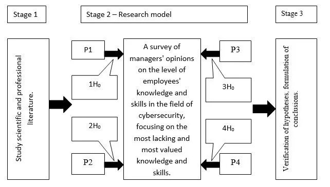 The research was conducted in 3 main stages (Figure 1). In Stage 1, we focused on the study of scientific and professional literature with a focus on cybersecurity. In stage 2, the research hypotheses were formulated. At the same time, a research model (research variables model) was created to verify them. Stage 3 represented the statistical verification of the hypotheses and the formulation of conclusions.