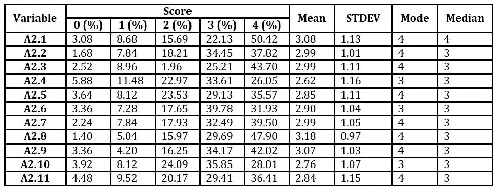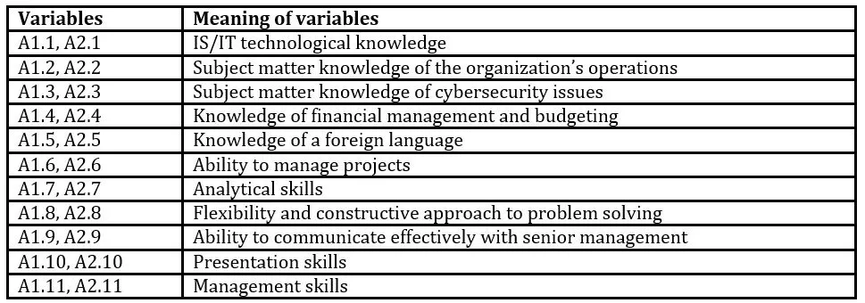 Respondents’ opinions were measured by two groups of variables. Both groups were rated on a 5-point Likert scale ranging from 0 to 4, with 0 meaning disagree not at all and 4 meaning agree completely. The first group consisted of variables A1.1, A1. 2.. A1.11, which characterized the knowledge and skills of employees in the field of cybersecurity that the company lacks most. The second group were variables A2.1, A2. 2…A2.11, which characterized the knowledge and skills in this area that the company values most. The variables of both groups had the same textual description that characterized their importance.