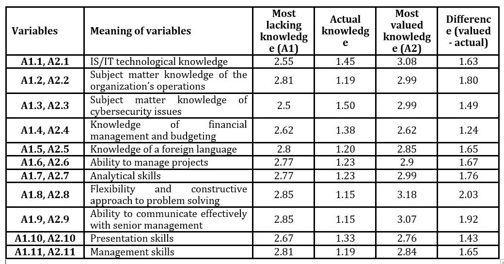 Table 3 shows that the variables rated with the highest percentages (indicating that it is cybersecurity knowledge and skills that the company is most lacking) include: