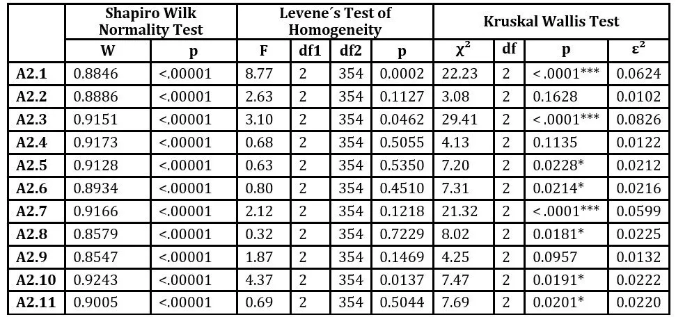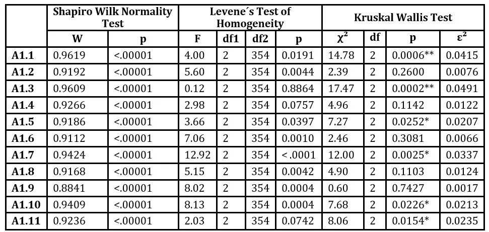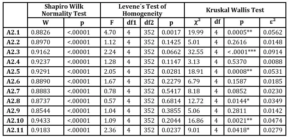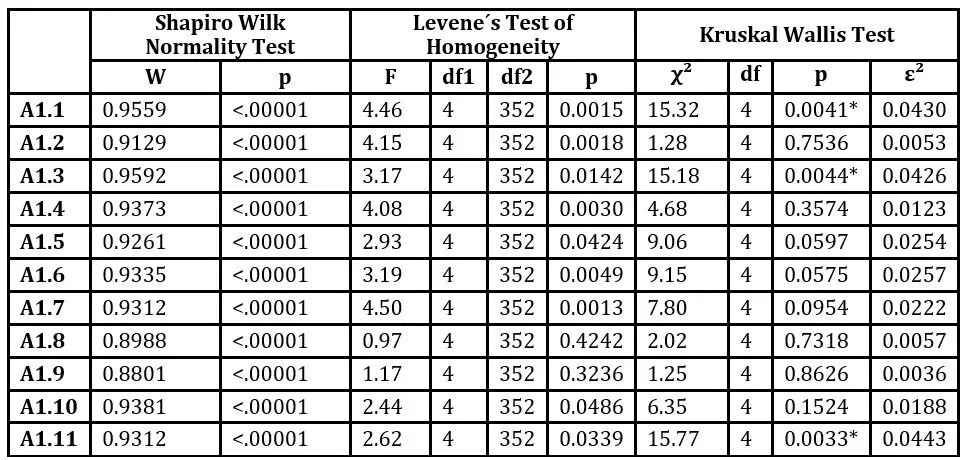 Statistical verification of relationships between ordinal variables (P1, P2, P3, P4) and scale-type variables (A1, A2) was conducted using the ANOVA statistical test. To verify the assumptions for using the ANOVA test, two tests were used: the Shapiro-Wilk test (to verify the normality of the research sample) and Levene’s test (to verify the homogeneity of the research sample). Since normality and homogeneity of the research sample were not confirmed, we used the non-parametric Kruskal-Wallis test for testing. The results of the verification are presented in Tables 6 to 9. Statistically significant values of the Kruskal-Wallis test are marked with an asterisk (*).
