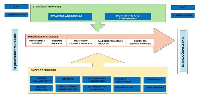 In the company, three processes are identified: strategic process, missionary process and support process. The strategic process consists of strategic direction monitoring and continuous improvement. Missionary processes are also identified: procurement process, storage process, inventory control process, sales dispensing process and customer service process. Finally, the support process consists of: quality, accounting, finance, human resources, and systems (Zapata-Cortes y otros, 2020).