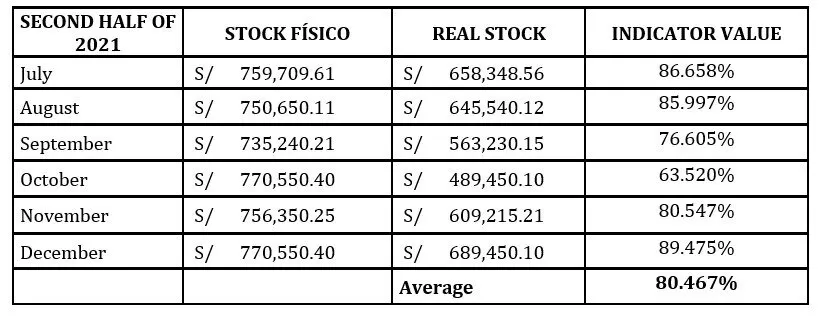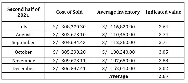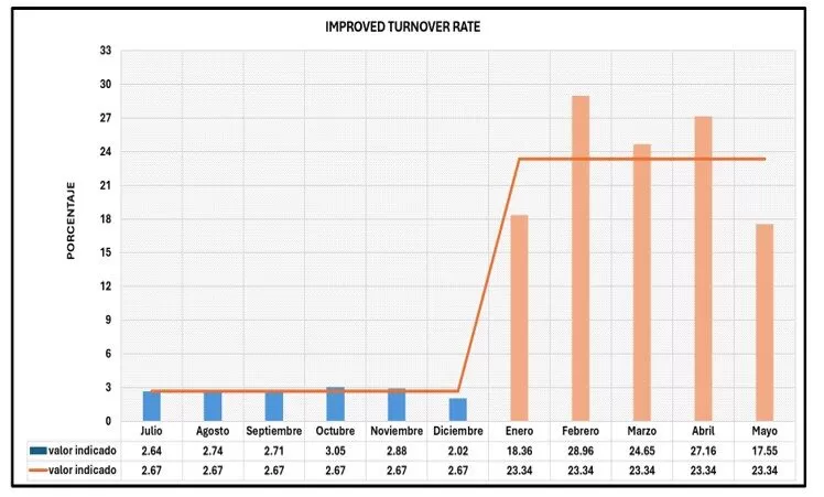 In Figure 12, the improvement of the average turnover index could be seen, going from 2.67 to 23.34. Below is the cash flow of the project with an NPV of S/. 36,009.15 and an IRR of 74%; with this result it can be concluded that the project is viable. In addition, an IR of 3.56 was obtained, which means that, for each sun that is invested, S / is profitable. 2.56