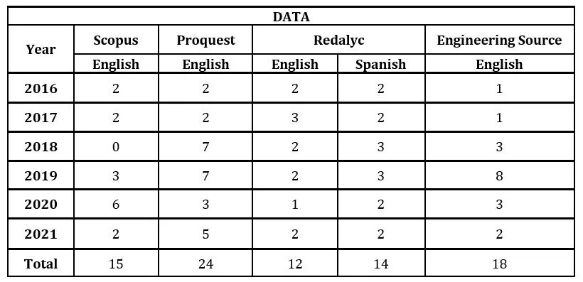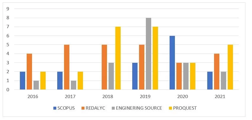 Figure 6 shows the number of total articles obtained from the data search, noting that most of the literature was obtained from Redalyc, with 26 research articles.