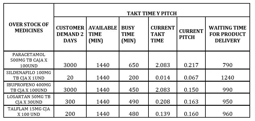 Table 4 shows 5 products or inputs that as a result of the classification by means of the takt time and pitch show a high waiting time for the delivery of each product