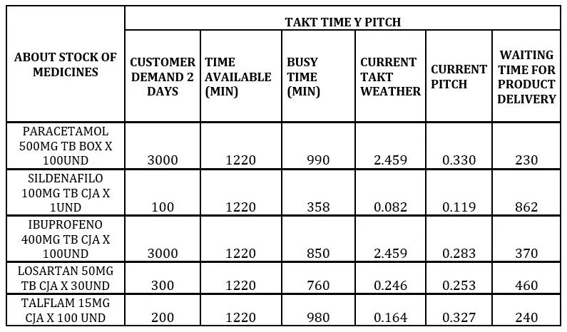 For the implementation of the Heijunka system, the takt time and pitch system were taken as an access point for the verification of waiting times for the delivery of a product or pharmaceutical input.
